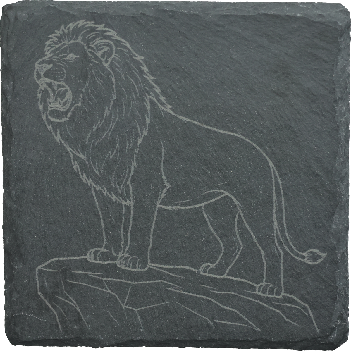 Slate coaster with an image of  a lion roaring standing on a rock , overlooking the valley below, lasered in the slate.